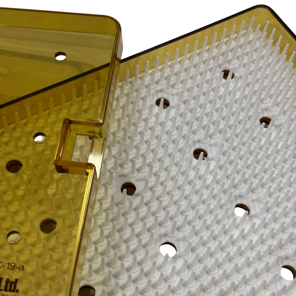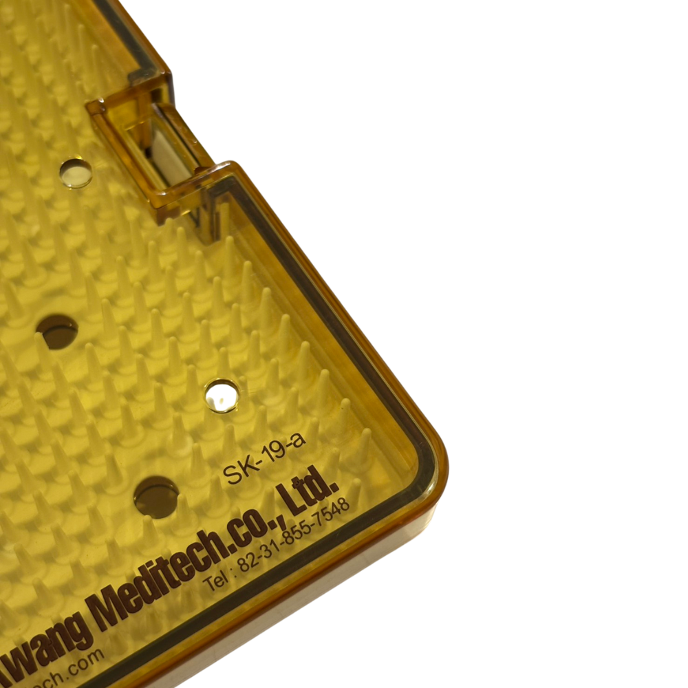 A protruded silicone embo mat is placed at the bottom of the case to securely hold instruments in place and prevent movement during handling and sterilization.